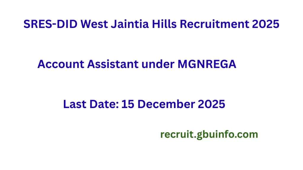 SRES-DID West Jaintia Hills Recruitment 2025: State Rural Employment Society – District Implementing Division (SRES-DID), West Jaintia Hills District, Jowai, has released an official notification for the recruitment of Account Assistant under the MGNREGA Programme. The appointment will be for one year, extendable based on performance.